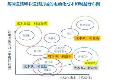 從圖上我們也發(fā)現(xiàn)一個(gè)過(guò)去沒(méi)有重視的地方,就是挖掘機(jī)。它其實(shí)應(yīng)該是電動(dòng)經(jīng)濟(jì)效益最大,而成本最低的機(jī)械!