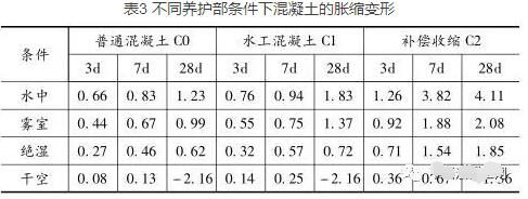 脹縮變形是混凝土的一項(xiàng)重要性質(zhì),不同的濕度條件和水分會對混凝土的脹縮變形造成不同的影響。我們通過不同的養(yǎng)護(hù)條件所造成的結(jié)果不同的現(xiàn)象,來探究濕度和水分對混凝土脹縮變形的影響(見表3)。