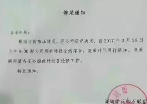 湖南常沅砂石聯(lián)盟近日發(fā)布停采通知,自2017年3月26日上午8:00起,該公司所有標段全線停采砂石,復(fù)采時間待定。這停采了,砂石供應(yīng)可咋辦呢?