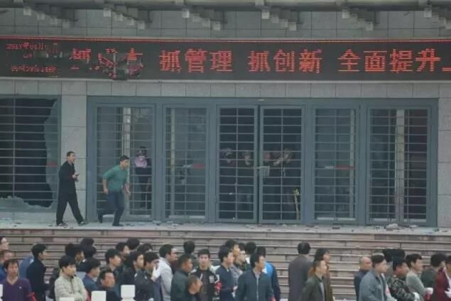 3月8日凌晨,袖纏紅護(hù)身符布條、手戴白手套,600多人拿著棍棒聚集在濟(jì)南104國道山東山水水泥集團(tuán)有限公司總部門口,強行沖進(jìn)大門,對辦公樓的幾個門進(jìn)行“砸打”,還從廠區(qū)強行把裝載機開上辦公樓門口回廊對辦公樓大門進(jìn)行蠻擊。此時,集團(tuán)辦公樓里山水高管和員工只有20余人,多人在防衛(wèi)中被外邊投擲的石塊砸中受重傷,躺在醫(yī)院。
