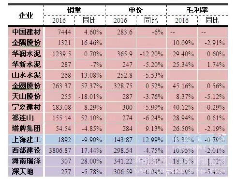 2016年,全國商品混凝土產(chǎn)量17.9億立方米,同比增長7.4%,混凝土與水泥制品行業(yè)實現(xiàn)利潤總額658億元,同比增長4.1%。從上市企業(yè)來看,14家由混凝土業(yè)務(wù)經(jīng)營的企業(yè)總銷量同比增長6.25%,但由于大部分企業(yè)混凝土銷售價格出現(xiàn)回落,導(dǎo)致13家企業(yè)(除金隅股份)整體銷售收入同比只有1.25%的提升,而11家企業(yè)(除中國建材、金隅股份、山水水泥)整體毛利潤同比下滑3.3%。