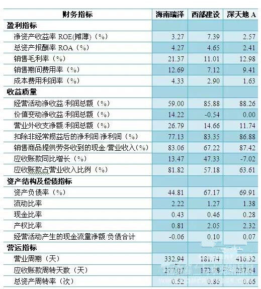 西部建設(shè)、深天地的資產(chǎn)負債率復(fù)合行業(yè)平均水平,海南瑞澤負債率較低,償債風險偏低,同時其他償債指標也顯示海南瑞澤具有較低的債務(wù)風險,但由于經(jīng)營活動產(chǎn)生的現(xiàn)金凈流量為負值,因此主營業(yè)務(wù)正常經(jīng)營的償債能力較弱,有待提升業(yè)務(wù)正常經(jīng)營的穩(wěn)定性和盈利能力。