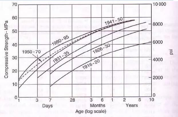 另一個(gè)特點(diǎn),水泥膠砂強(qiáng)度的變化很大,主要是固定水膠比的7d強(qiáng)度顯著增長(zhǎng),28d強(qiáng)度也是增強(qiáng)的很厲害。但是,另一個(gè)很重要的指標(biāo)卻沒(méi)進(jìn)步過(guò),那就是28d齡期之外的強(qiáng)度。我們知道在1970年需要0.50的水灰比,混凝土立方體強(qiáng)度才能達(dá)到32.5MPa。而1984年則需要0.57的水灰比。保持混凝土的每立方米用水量為相同的175kg/m3,假定工作性能保持一致,即則水泥用量從350kg/m3降低到307kg/m3。為了更易被碳化或被侵蝕物質(zhì)滲透,我們慢慢采用更高水膠比和更低水泥用量來(lái)使得混凝土具有更高滲透性,這樣的話(huà),一般混凝土耐久性就更低了。與使用“舊”水泥的混凝土相比,快速獲得早期強(qiáng)度也意味更早獲得足夠的拆模強(qiáng)度,這樣就停止了早期有效養(yǎng)護(hù)。從而使混凝土性能不能得到長(zhǎng)期改善。