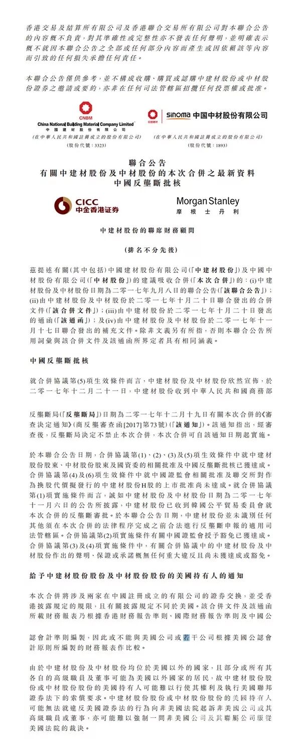 中國建材(03323)與中材股份(01893)聯(lián)合公布,2017年12月21日,中建材股份收到中國商務部反壟斷局日期為2017年12月19日有關此次合并的《審查決定通知》,經(jīng)審查后,反壟斷局決定不禁止此次合并,此次合并可自該通知日期起實施。