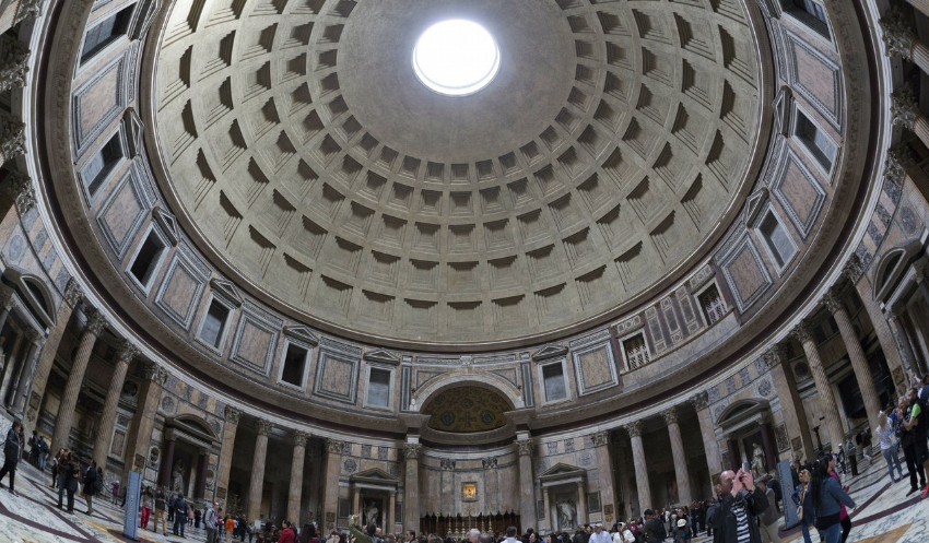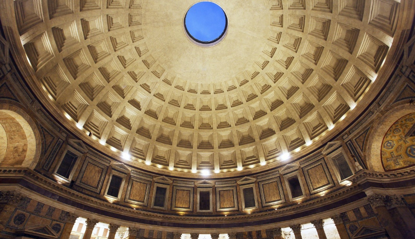 穹頂頂部的矢高和直徑一樣,也是43.3米,這樣,萬神殿的剖面恰好可以容得下一個(gè)整圓,而它的內(nèi)部墻面兩層分割也接近于黃金分割,因此它常被作為通過幾何形式達(dá)到構(gòu)圖和諧的古代實(shí)例。