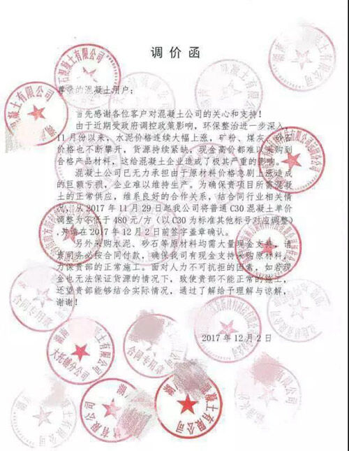 12月中旬長沙地區(qū)混凝土企業(yè)向合作施工單位發(fā)布的調(diào)價函