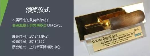 其中,亞洲金鏝刀獎(jiǎng)報(bào)名已于2018年9月30日截止、已在緊張?jiān)u選中,并將于2018年11月20日在上海新國(guó)際博覽中心舉辦的亞洲混凝土世界博覽會(huì)上隆重公布獲獎(jiǎng)名單并舉行頒獎(jiǎng)儀式;獲獎(jiǎng)?wù)哌€將受邀參加于2019年1月22-25日期間在美國(guó)拉斯維加斯會(huì)展中心舉辦的美國(guó)混凝土世界博覽會(huì)。