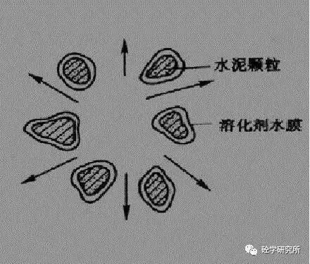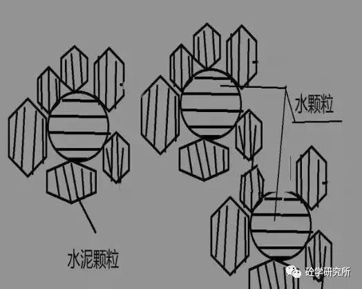 種水泥拌合物狀態(tài)為工地常見狀態(tài),也就是說一個水顆粒被N多的這個水泥顆粒包裹著。那么水泥顆粒與水泥顆粒之間有非常大的這個電子吸附效應(yīng),還有內(nèi)摩角度。這樣同等用水量情況下混凝土看上去比較干燥,并且流動性不佳。
