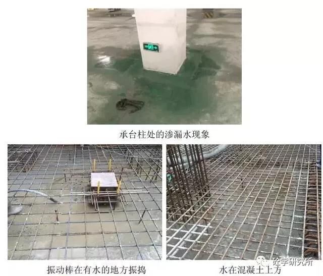 在工程實踐中,如積水未抽除,這些積水一部分會被混凝土吸收,從混凝土內(nèi)部由下向上泌出,成為天然的泌水,成為后期“點”滲漏的薄弱環(huán)節(jié),如承臺處,積水可能會順著柱鋼筋向上泌出,在鋼筋附近形成由下向上的滲水通道,成為后期滲漏水的薄弱環(huán)節(jié);