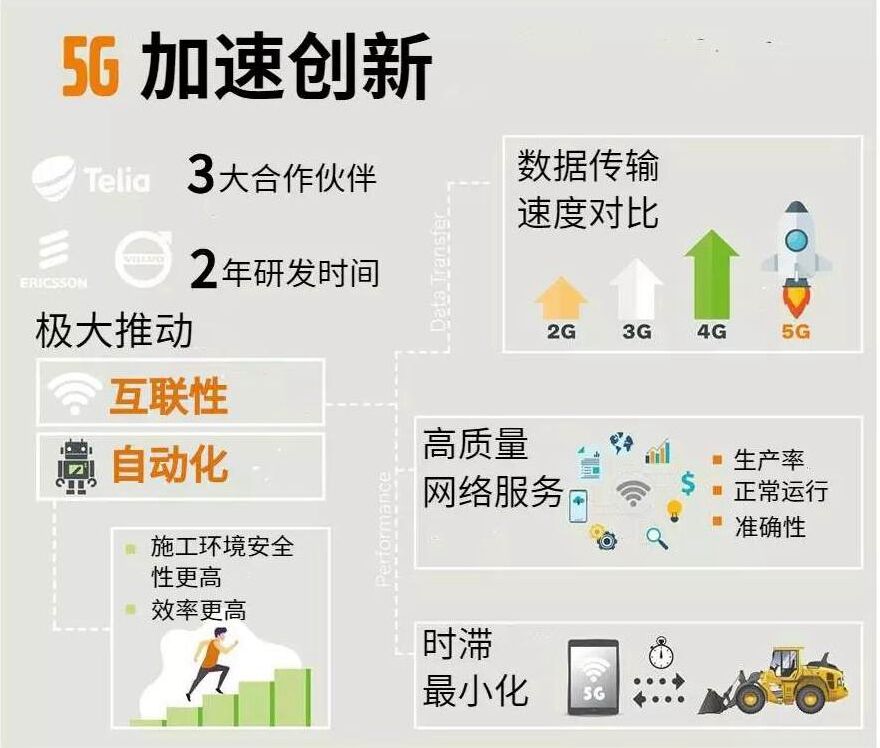 2019年3月,沃爾沃建筑設備攜手瑞典電信運營商特利亞(Telia)和愛立信啟動了瑞典首個工業(yè)5G網(wǎng)絡,將用于遠程控制輪式裝載機測試。憑借極短的響應時間、大容量、高度的移動網(wǎng)絡可接入性,5G技術能為提高效率、降低成本和降低環(huán)境風險。