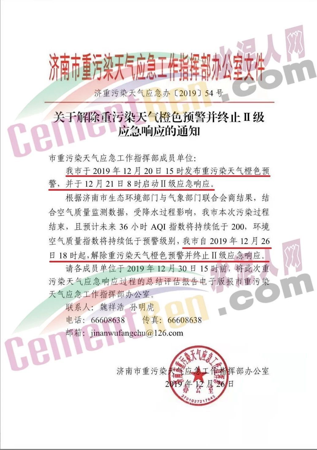 同期,山東省濟南市重污染天氣應急工作指揮部辦公室發(fā)布了《關于解除重污染天氣橙色預警并終止II級應急響應的通知》稱,自2019年12月26日18時起,解除重污染天氣橙色預警并終止II級應急響應。通知原文如下: