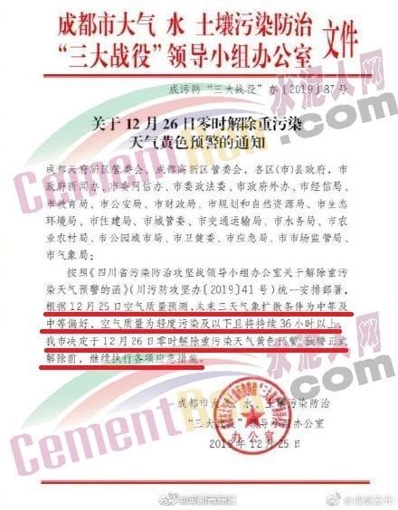 12月25日,四川省成都市大氣水土壤污染防治三大戰(zhàn)役領導小組辦公室發(fā)布了《關于12月26日零時解除重污染天氣黃色預警的通知》稱,成都市定于12月26日零時解除重污染天氣黃色預警,預警正式解除前,繼續(xù)執(zhí)行各項應急措施。通知原文如下: