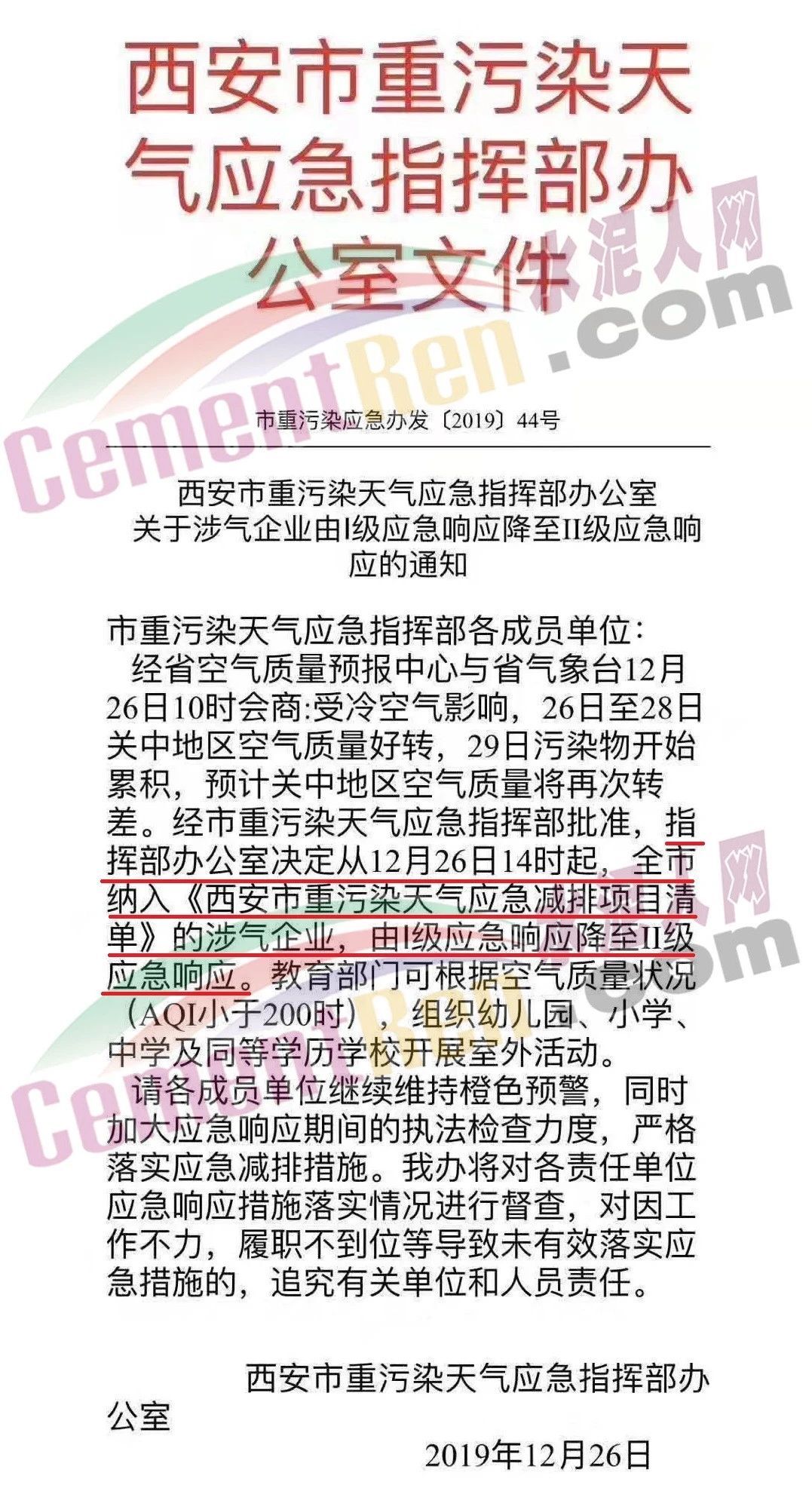 12月26日,陜西省西安市重污染天氣應急指揮部辦公室發(fā)布了《關于涉氣企業(yè)由I級應急響應降至II級應急響應的通知》稱,西安市指揮部辦公室定于12月26日14時起,全西安市納入《西安市重污染天氣應急減排項目清單》的涉氣企業(yè),由I級應急響應降至II級應急響應。通知原文如下: