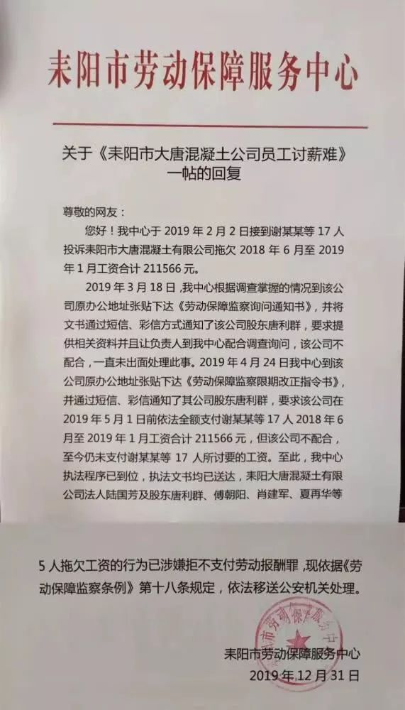 關(guān)于“耒陽(yáng)市大唐混凝土公司員工討薪難”一貼的回復(fù)