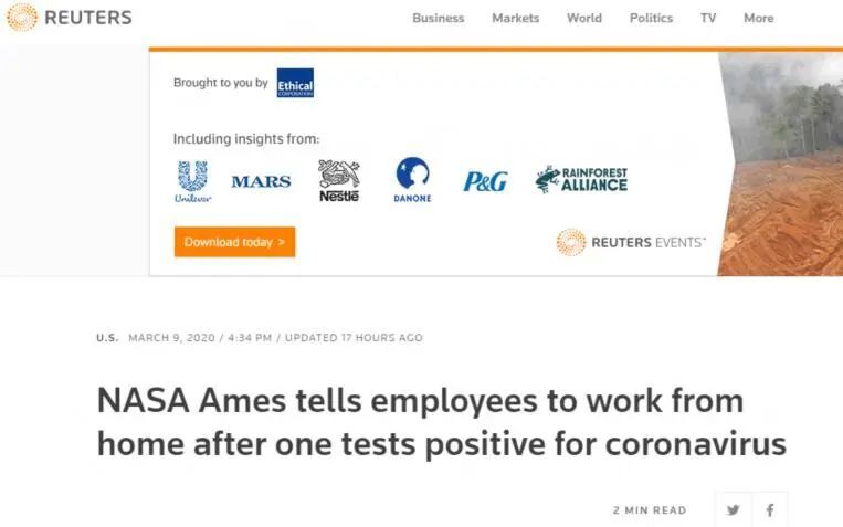 據(jù)路透社3月9日報道,美國國家航空航天局(NASA)位于加利福尼亞州的艾姆斯研究中心3月8日發(fā)表聲明稱,該中心一員工新冠病毒檢測呈陽性。出于謹慎考慮,該中心要求其他員工在家工作,直到另行通知。