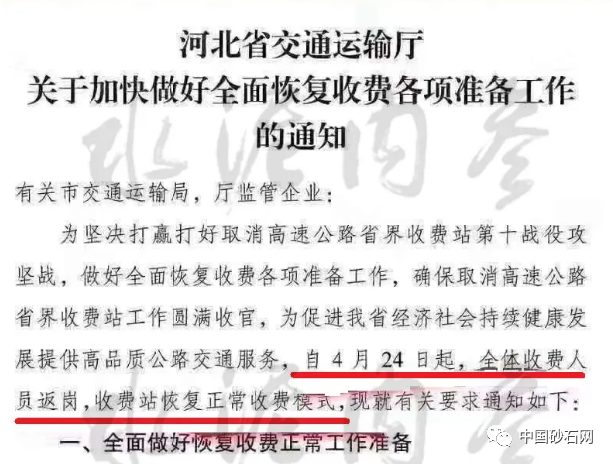 據(jù)中國砂石協(xié)會和中國砂石網(wǎng)了解,日前,河北省交通運輸廳發(fā)布《關(guān)于加快做好全面恢復(fù)收費各項準(zhǔn)備工作的通知》稱為堅決打贏打好取消高速公路省界收費站第十戰(zhàn)役攻堅戰(zhàn),做好全面恢復(fù)收費各項準(zhǔn)備工作,確保取消高速公路省界收費站工作圓滿收官,為促進全省經(jīng)濟社會持續(xù)健康發(fā)展提供高品質(zhì)公路交通服務(wù),自4月24日起,全體收費人員返崗,收費站恢復(fù)正常收費模式。