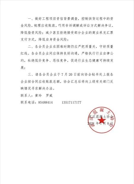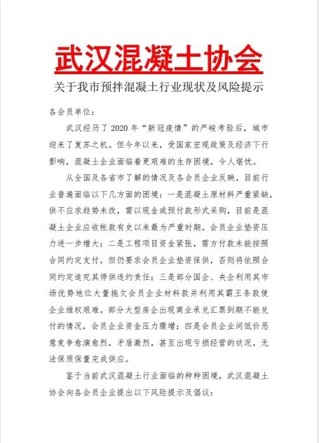鑒于當前武漢混凝土行業(yè)面臨的種種困境,武漢混凝土協(xié)會向各會員企業(yè)提出以下風險提示及倡議∶