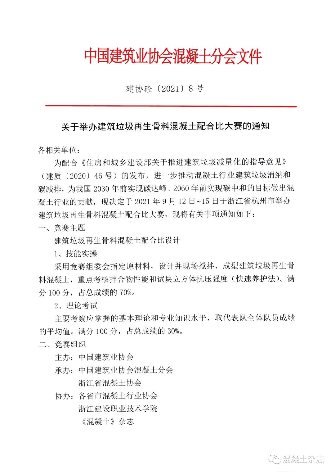 為配合《住房和城鄉(xiāng)建設(shè)部關(guān)于推進(jìn)建筑垃圾減量化的指導(dǎo)意見》(建質(zhì)〔2020〕46號)的發(fā)布,進(jìn)一步推動混凝土行業(yè)建筑垃圾消納和碳減排,為我國2030年前實現(xiàn)碳達(dá)峰、2060年前實現(xiàn)碳中和的目標(biāo)做出混凝土行業(yè)的貢獻(xiàn),現(xiàn)決定于2021年9月12日~15日于浙江省杭州市舉辦建筑垃圾再生骨料混凝土配合比大賽。