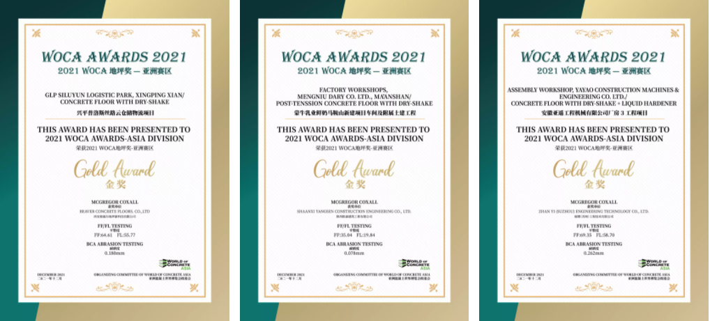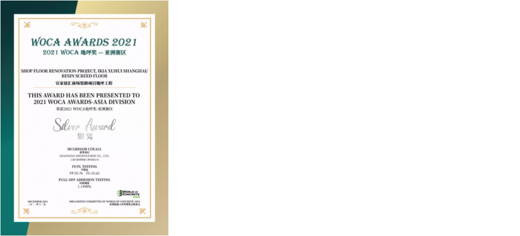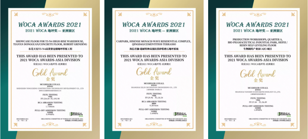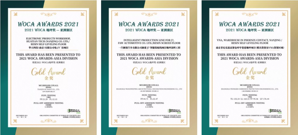 經(jīng)過對(duì)多個(gè)項(xiàng)目進(jìn)行地坪檢測(cè),三大類中13個(gè)優(yōu)秀項(xiàng)目獲得了2021 WOCA 地坪獎(jiǎng)(WOCA AWARDS)-亞洲賽區(qū)的榮譽(yù)。