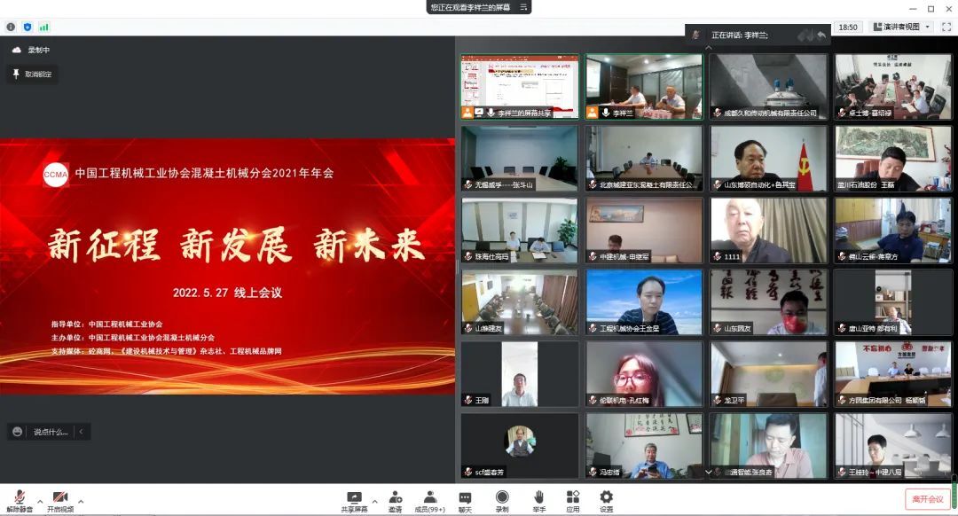 2022年5月27日,以“新征程 新發(fā)展 新未來 ”為主題的中國工程機械工業(yè)協(xié)會混凝土機械分會年會在線上隆重召開。中國工程機械工業(yè)協(xié)會會長蘇子孟、名譽會長祁俊、協(xié)會顧問龍國鍵、副秘書長呂瑩、副秘書長王金星、副秘書長尹曉荔、其他分支機構(gòu)領(lǐng)導、混凝土機械分會會長符忠軒、名譽會長盛春芳、秘書長李祥蘭、顧問易君、分會秘書處、分會理事及會員單位相關(guān)負責人、行業(yè)上下游企業(yè)與行業(yè)專家等在內(nèi)的兩百余人參與此次會議。