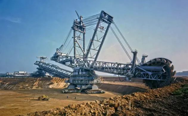 這是由德國克虜伯Krupp出品的世界上最大挖掘機,96米高(相當(dāng)于30層樓),240米長,49米寬,14210噸重,其裝備20個8.6立方米鏟斗,總裝機容量2萬千瓦,輪斗驅(qū)動采用3臺1680千瓦電機,總功率5040千瓦(6600馬力)。只需一天,這個大家伙就能挖出24萬立方米土。曾有一次一輛80噸的推土機不幸被挖起并塞到了輪斗軸承里,可見它的力量之大。其移動速度最大為600m/h,制造費用達到1億美元。挖掘機技術(shù)哪家強?德國克虜伯敢稱王~