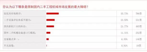 工程機(jī)械區(qū)別于其他行業(yè)一個(gè)重要的地方是,二手商品的回收利用尤為重要,因?yàn)橐粋€(gè)機(jī)械的生命周期相對于快消品來說更長,所以在二手商品的回收、租賃同樣存在巨大機(jī)會。但是該行業(yè)目前發(fā)展前景不明朗。在慧聰工程機(jī)械網(wǎng)的一項(xiàng)“限制二手工程機(jī)械市場發(fā)展的最大障礙”的投票中,“混亂的市場秩序”得票最高,796票,“二手設(shè)備評估體系不健全”排名第二,得票531,“國內(nèi)新機(jī)的巨大庫存”排名第三,得票485。