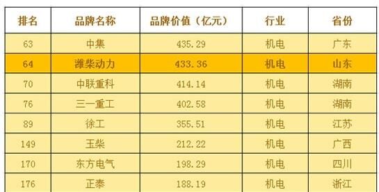 2016年5月12日,中國(guó)品牌價(jià)值500強(qiáng)評(píng)審委員會(huì)揭曉第十屆中國(guó)品牌價(jià)值500強(qiáng)榜單。濰柴動(dòng)力以433.36億元的品牌價(jià)值排名第64位。