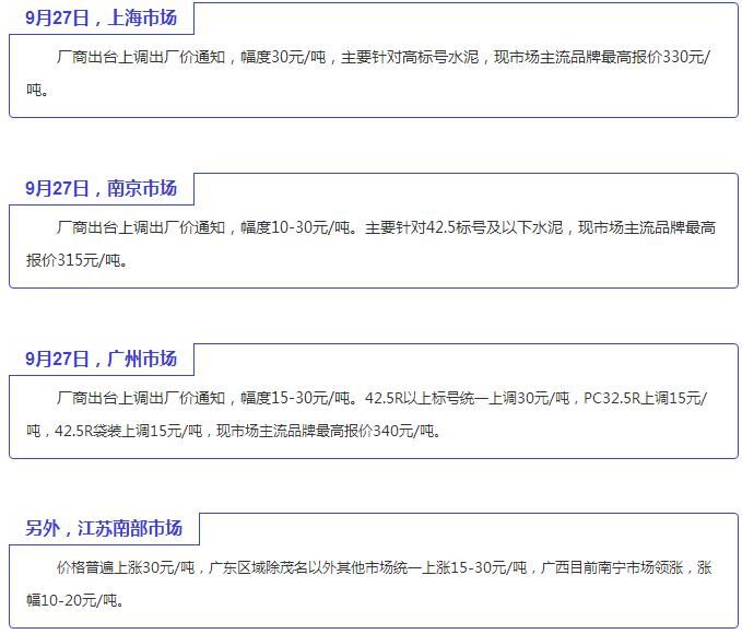 水泥方面,東北地區(qū)即將進(jìn)入往年慣例長(zhǎng)時(shí)間的停窯限產(chǎn)階段,避免產(chǎn)能過(guò)剩,穩(wěn)定現(xiàn)有價(jià)格,因此短期內(nèi)價(jià)格波動(dòng)的可能性不大。華北地區(qū)行情持續(xù)升溫,水泥銷售情況良好,再加上停窯措施落實(shí)到位。從現(xiàn)階段市場(chǎng)進(jìn)度來(lái)看,預(yù)計(jì)10月中上旬水泥價(jià)格進(jìn)行上調(diào)。
