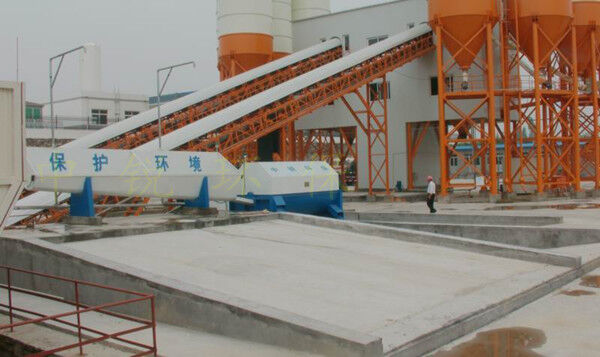 該系統(tǒng)主要由:攪拌車加水清洗裝置,溜槽輸送裝置,砂石漿水分離裝置,和泥漿水后處理裝置組成。混凝土輸送設(shè)備清洗后,將殘余混凝土排入溜槽中,在高壓水流沖擊下,經(jīng)溜槽進入砂石分離機,在不斷旋轉(zhuǎn)的分離機作用下,對混凝土進行充分的清洗,同時將砂、石進行分離,分離后的砂、石在導(dǎo)料葉片的作用下背向流動,再通過提升式出料口排出分離機,分別堆放。清洗后的漿水從分離機的底部排出進入沉淀池逐級沉淀后循環(huán)使用或進入攪拌池回收利用。進入攪拌池(一般情況2個攪拌池)的漿水為了防止沉淀凝固,需通過攪拌器的作用,攪拌器的工作為間歇式。分離出水泥漿在連續(xù)的攪拌器作用下,再通過高壓污水泵輸送到攪拌樓中待生產(chǎn)計量再利用。整個控制系統(tǒng)設(shè)有手動和自動控制,方便控制設(shè)置,整個系統(tǒng)運行可靠,故障率低,維護量少等特點。