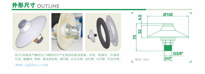 助流氣蝶前部是多孔金屬,外部通入的高壓空氣,經(jīng)過(guò)氣嘴后均勻分散在氣嘴周?chē)?,促使粉料流?dòng),達(dá)到助流效果。流化效果由氣嘴數(shù)量確定,不同的粉料及容器狀況需要不同數(shù)量的氣嘴。本產(chǎn)品具有安裝維護(hù)方便,價(jià)格低廉、流化效果明顯等突出優(yōu)點(diǎn)。 是水泥倉(cāng)頂除塵器,攪拌站倉(cāng)頂除塵器,以及水泥罐倉(cāng)頂除塵器重要元件。
