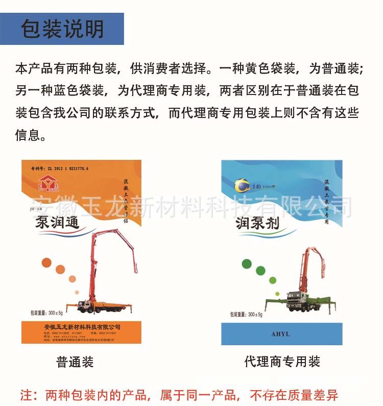 泵車潤(rùn)管劑(泵潤(rùn)通)產(chǎn)品使用了可降解彩色復(fù)膜包裝,包裝規(guī)格:50袋/箱,300克/袋。本產(chǎn)品應(yīng)儲(chǔ)存于防曬、通風(fēng)、干燥處,保質(zhì)期:三年。