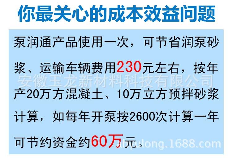 泵潤(rùn)通產(chǎn)品使用一次,可節(jié)省潤(rùn)泵砂漿、運(yùn)輸車輛費(fèi)用230元左右,按年產(chǎn)20萬(wàn)方混凝土、10萬(wàn)立方預(yù)拌砂漿計(jì)算,如每年開(kāi)泵按2600次計(jì)算一年可節(jié)約資金約60萬(wàn)元。