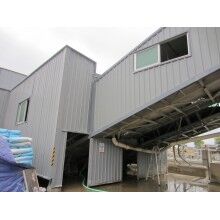 2)料倉棚:立柱采用450*5角鋼,立柱角鋼間的橫向聯(lián)系及斜撐采用∠30角鋼;拱架采用Φ48*2mm鍍鋅鋼管,斜撐及聯(lián)系采用Φ21*1.5mm鍍鋅鋼管及∠30角鋼。屋面檁條采用12#鍍鋅C型鋼。屋面彩鋼棚采用0.3mm厚藍(lán)色彩鋼板,頂棚排水采用630*1.2mm鍍鋅檐溝。