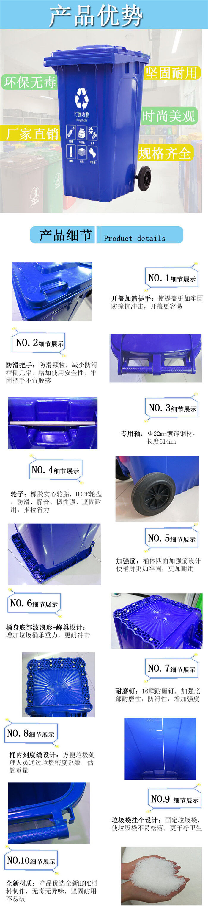 5.適用范圍:塑料垃圾桶適用于大街、社區(qū)、醫(yī)院、餐廚、醫(yī)療、小區(qū)、學(xué)校、市政等行業(yè)