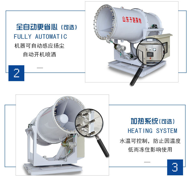 直徑相近的水霧和的粉塵顆粒黏貼,減小水表面的張力,使粉塵顆粒與水霧聚結(jié)成團(tuán),在重力作用下,然后沉降到地面。達(dá)到有效降塵的目的。霧炮機(jī)的噴水距離為30到150米,具體規(guī)格可以定制,配套水箱可選3-10噸,主要作用是噴霧抑塵,