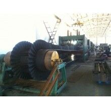 大傾角波狀擋邊帶由基帶、擋邊、橫隔板3部分組成。擋邊起防止物料測滑撒落的作用。為便于繞過滾筒,檔邊設(shè)計成波紋狀;橫隔板的作用是承托物料,為了實現(xiàn)大傾角輸送,采用TTC型。檔邊和橫隔板是用二次硫化的方法與基帶連接的,具有很高的連接強度。