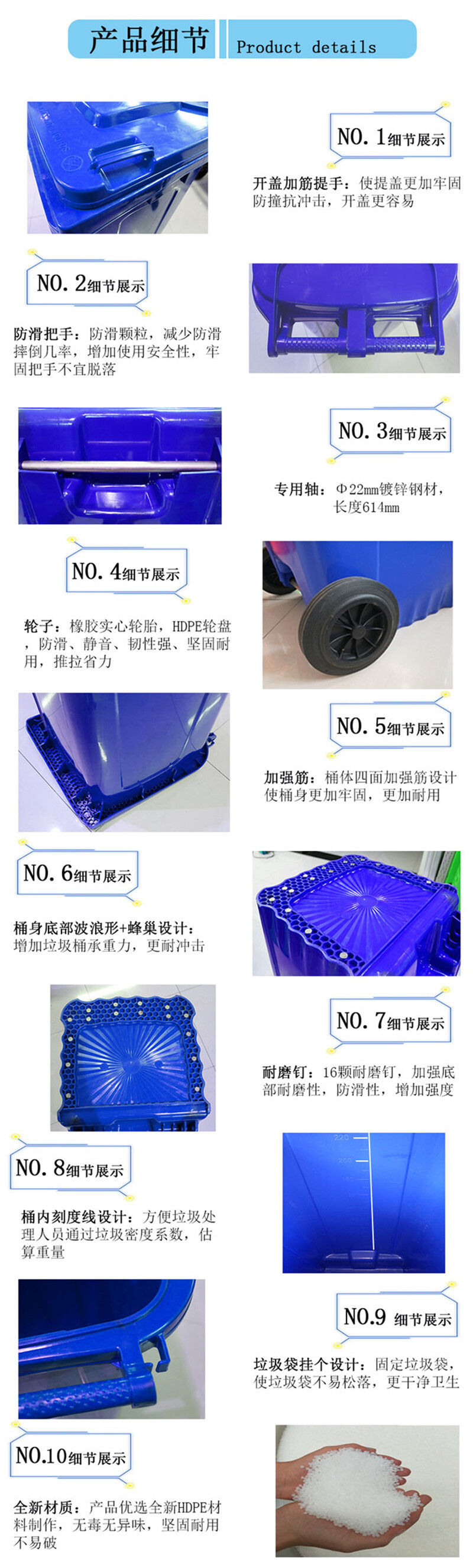 240L塑料垃圾桶/塑料環(huán)衛(wèi)垃圾桶,桶蓋密合,可防止異味散發(fā),雨水侵入,蚊蠅滋生,桶身可相互套疊,方便運(yùn)輸,節(jié)省儲運(yùn)空間與費(fèi)用,桶內(nèi)外表面光潔,便于倒空垃圾與清洗,垃圾桶設(shè)計(jì)符合 人體工程學(xué),輕便耐用,移動靈活。產(chǎn)品賣點(diǎn)。240L塑料垃圾桶價(jià)格不浪費(fèi),讓城市更美觀少占地:生活垃圾中有些物質(zhì)不易降解,使土地受到嚴(yán)重侵蝕。垃圾分類,去掉能回收的,不易降解的物質(zhì),減少垃圾數(shù)量達(dá)50%以上。少環(huán)境污染:廢棄的電池含有金屬。約資源鎘等有害的物質(zhì)。