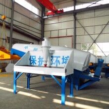 落地式砂石分離機(jī)整套系統(tǒng)主要由:攪拌車加水清洗裝置,溜槽裝置,砂石漿水分離裝置,和泥漿水后處理裝置組成?;炷凛斔驮O(shè)備清洗后,將殘余混凝土排入溜槽中,在高壓水流沖擊下,經(jīng)溜槽進(jìn)入砂石分離機(jī),在不斷旋轉(zhuǎn)的分離機(jī)作用下,對(duì)混凝土進(jìn)行充分的清洗,同時(shí)將砂石、漿水進(jìn)行分離,分離后的砂、石在導(dǎo)料葉片的作用下背向流動(dòng)至出料口排出分離機(jī)落入振動(dòng)篩分機(jī),通過(guò)篩分將沙、石子分開(kāi),分別堆放。清洗后的漿水從分離機(jī)的溢水口排出進(jìn)入濃漿池,經(jīng)污水泵加壓打到旋流器除去多余固體微粒,降低漿水濃度,進(jìn)入攪拌池回收利用。進(jìn)入攪拌池的漿水為了防止沉淀凝固,需通過(guò)攪拌器的作用,攪拌器的工作為間歇式。分離出水泥漿在連續(xù)的攪拌器作用下,再通過(guò)高壓污水泵輸送到攪拌樓中待生產(chǎn)再利用。整個(gè)控制系統(tǒng)設(shè)有手動(dòng)和自動(dòng)控制,方便控制設(shè)置,整個(gè)系統(tǒng)運(yùn)行可靠,故障率低,維護(hù)量少等特點(diǎn)。