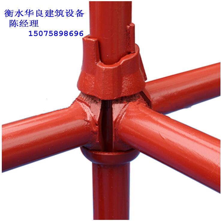 碗扣腳手架獨特的結點設計,雖仍應歸為鉸接,但卻能夠承受相對更大的荷載,再加上其立桿上的上碗和橫桿上的插片均為鍛鋼的工藝,使這款碗扣腳手架系統(tǒng),在國外被廣泛地應用于化工廠、煉油廠、油田以及大型船艦維修等荷載相對較高的領域??紤]到系統(tǒng)的穩(wěn)定性,安裝斜桿是必須的。為了補足這個弱項,該系統(tǒng)特意設計了另外一類斜桿,在斜桿的兩頭,均用高強度螺栓,各固定半個旋轉扣件,扣件亦采用鍛鋼工藝。這樣,盡管斜桿無法直接在碗扣的結點扣接,但可以用扣件扣接在橫桿或立桿的適當位置上,也大大地改善了系統(tǒng)的穩(wěn)定性。